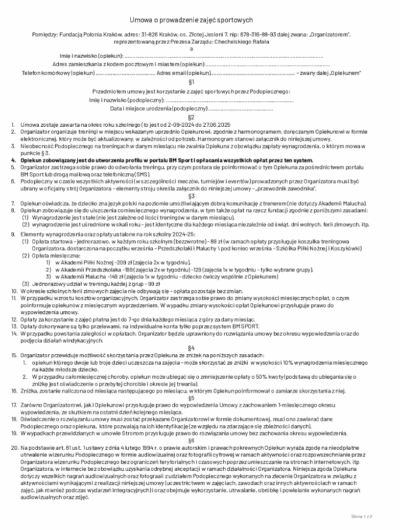 Zachęcamy Państwa do zapoznania się z umową uczestnictwa w zajęciach organizowanych przez Akademię Piłkarską Polonia Kraków. Dokument ten zawiera wszystkie najważniejsze informacje dotyczące zasad udziału w treningach, warunków płatności, organizacji zajęć oraz kwestii związanych z bezpieczeństwem i odpowiedzialnością. Znajomość tych zasad pozwoli uniknąć nieporozumień i zapewni komfortowy przebieg całego sezonu zarówno dla dzieci, jak i rodziców.